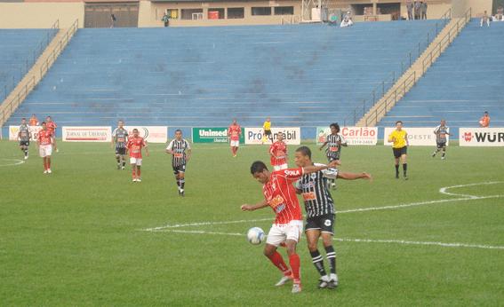 Foi uma apresentação de gala. Uma das melhores da equipe do Uberaba Sport Club nos últimos anos jogando no Uberabão (foto). No jogo diante do Rio Branco de Vitória/ES, válido pela quinta rodada do Grupo A7 do Brasileirão Série D, realizado na tarde/noite deste sábado (14) no Uberabão, a equipe apresentou um futebol que encheu os olhos do torcedor que, infelizmente não compareceu em grande número no Uberabão, mas os que foram saíram felizes e satisfeitos. A goleada de 6 a 1 demonstrou que a equipe comandada pelo técnico Marcos Birigui está bem treinada e, já classificada para a próxima fase da competição, poderá realmente alcançar seu objetivo que é uma vaga para o Campeonato Brasileiro da Série C da próxima temporada. A primeira etapa, iniciou mostrando um futebol muito truncado. O Uberaba tentava jogadas pelo setor central de ataque, porém sempre esbarrava em uma forte marcação dos defensores do Rio Branco. USC 1 a 0 – Aos 18 minutos, quando a equipe resolveu jogar usando as laterais o Uberaba abriu o marcador. Uma jogada muito rápida pelo setor direito, Augusto César foi até a linha de fundo e cruzou rasteiro. A bola sobrou do outro lado para Fabiano que passou para Rafael Ipuã que não conseguiu dominar. Na sequência, Ivonaldo pegou o rebote tocando novamente para Augusto César que dominou, foi à linha de fundo e fez o cruzamento para a rápida chegada de Rafael Ipuã tocar para o fundo do gol defendido pelo goleiro Valter fazendo o primeiro gol do Uberaba no jogo. USC 2 a 0 – O segundo gol não demorou a acontecer. Aos 25 minutos, após excelente jogada pelo setor esquerdo na tabelinha de Fabiano com o zagueiro Felipe, Fabiano recebeu na frente da zaga e na entrada da grande área cruzou na medida para a cabeçada de André Nascimento que fez o segundo gol do Colorado no jogo. Estes dois gols demonstraram que as jogadas pelas laterais de campo era o caminho para a vitória já que era por aqueles dois setores que o Uberaba conseguia chegar com muito perigo como aconteceu aos 30 minutos após Rafael Ipuã tocar para Fabiano que da entrada da grande área bateu forte para grande defesa do goleiro Valter que evitou o terceiro gol do Uberaba naquele momento. Outra boa jogada aconteceu aos 36 minutos após passe de Augusto César para André Nascimento que de fora da área bateu forte para outra importante defesa do goleiro capixaba. USC 3 a 0 – Dois minutos após este lance, aos 38, o ala Ivonaldo em jogada de muita rapidez, fez lançamento em profundidade para André Nascimento que serviu na media para Augusto César. O atacante dominou, parou, esperou a zaga do Rio Branco se posicionar, driblou dois zagueiros e tocou por cobertura no ângulo superior esquerdo de Valter fazendo um golaço que levou a torcida ao delírio e ao técnico e jogadores do Rio Branco ao desespero. Antes do término do primeiro tempo, os jogadores do Uberaba ainda criaram duas boas chances de ampliar o marcador. Primeiro aos 43 minutos com Rafael Ipuã dominando o lance e tocando para Fabiano bater forte, mas por cima do gol adversário. O segundo lance foi aos 46 minutos. Fabiano bateu muito bem uma falta pelo setor direito e só não fez o quarto gol porque o excelente goleiro Valter tocou de ponta de dedo para a linha de fundo. Não deu tempo nem para bater o escanteio já que o árbitro na sequência deu por encerrado a primeira etapa. Para a etapa complementar, a equipe do Rio Branco voltou disposta a conseguir uma melhor sorte na partida. O Uberaba voltou mais cauteloso, não forçando muito o ataque e sem aquela ansiedade da primeira etapa não mostrava o mesmo futebol. A equipe adversária até que tentou chegar ao gol defendido pelo goleiro Glaisson. Aos 3 minutos Cleiton conseguiu chegar até a linha de fundo pelo setor esquerdo, porém o cruzamento não saiu como deveria. A defesa do Uberaba se mostrava tranqüila e bem posicionada já que os ataques do Rio Branco não surtiram efeito. O Uberaba só conseguiu chegar pela primeira vez na etapa complementar aos 15 minutos depois de jogada de Rafael Ipuã com André Nascimento, porém a conclusão foi um tanto quanto equivocada. Aos 16 minutos o Rio Branco quase diminuiu o placar. Cleiton fez boa jogada pelo setor direito fazendo lançamento para a grande área. O goleiro Cleysson saiu mal na bola que sobrou para a defesa do Colorado aliviar o perigo tocando a bola para escanteio. USC 4 a 0 – Aos poucos o Uberaba foi novamente retomando o domínio do jogo até os 22 minutos quando, após cobrança de falta pelo setor direito, apareceu como sempre tem acontecido, o zagueiro Luciano que desviou de cabeça fazendo o quarto gol do Colorado no jogo. Após este gol, o desespero tomou conta de vez dos jogadores e comissão técnica do Rio Branco. Até sua torcida que se fazia presente no Uberabão passou a recolher suas faixas. Rio Branco diminui – Mas foi em meio a esse desespero que a equipe capixaba chegou a diminuir o placar. Aos 29 minutos, o esforçado Cleiton soltou uma verdadeira “bomba” da entrada da grande área colocando a bola no ângulo superior direito do goleiro Gleysson que nada pode fazer. USC 5 a 1 – Mas de nada adiantou o gol do Rio Branco. Cinco minutos depois, aos 34, Evandro que havia entrado no lugar do atacante André Nascimento, dominou na entrada da grande área tocando para Balduíno que bateu forte vencendo mais uma vez o goleiro Valter ampliando ainda mais a goleada do Uberaba diante do Rio Branco. Expulsões – Com o placar a favor e a vitória praticamente garantida, a equipe do Uberaba passou a tocar a bola principalmente com o habilidoso atacante Augusto César. Isso irritou os jogadores do Rio Branco que passaram a literalmente “caçar” o atacante em campo. Primeiro foi o zagueiro Edson Pipoca que após entrada violenta em Augusto César recebeu cartão vermelho. Depois foi a vez do outro zagueiro, o jogador Nino. Após receber um humilhante “chapéu” fez falta violent